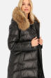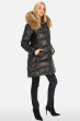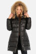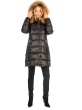 Puchowa czarna kurtka damska z naturalnym futrem to jeden z efektowniejszych modeli marki Perso. Została uszyta z lekko połyskującej tkaniny przepikowanej w poziome linie wyginające się ku dołowi. Model posiada wygodny, ale nieodpinany kaptur, ozdobiony bardzo ładnym futrem naturalnym z jenota. Samo futerko można odpiąć. Okrycie zapina się pod szyję na dwudzielny suwak. Dwie przednie ukośne kieszenie ozdobione zostały złotymi metalowymi dodatkami i troczkami z tego samego materiału, co tkanina wierzchnia.