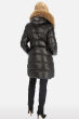 Puchowa czarna kurtka damska z naturalnym futrem to jeden z efektowniejszych modeli marki Perso. Została uszyta z lekko połyskującej tkaniny przepikowanej w poziome linie wyginające się ku dołowi. Model posiada wygodny, ale nieodpinany kaptur, ozdobiony bardzo ładnym futrem naturalnym z jenota. Samo futerko można odpiąć. Okrycie zapina się pod szyję na dwudzielny suwak. Dwie przednie ukośne kieszenie ozdobione zostały złotymi metalowymi dodatkami i troczkami z tego samego materiału, co tkanina wierzchnia.